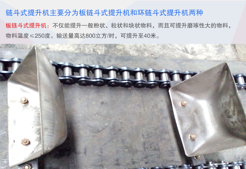鏈斗式提升機(jī)主要分為板鏈斗式提升機(jī)和環(huán)鏈斗式提升機(jī)兩種。