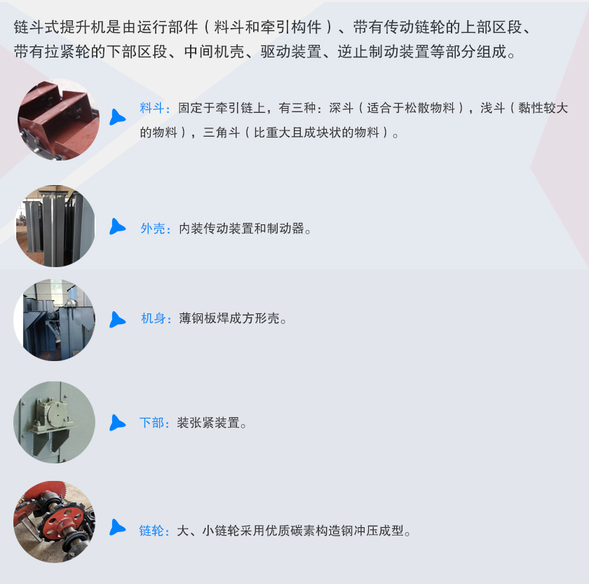 鏈斗式提升機(jī)是由運(yùn)行部件(料斗和牽引構(gòu)件)、帶有傳動鏈輪的上部區(qū)段、帶有拉緊輪的下部區(qū)段、中間機(jī)殼、驅(qū)動裝置、逆止制動裝置等部分組成。