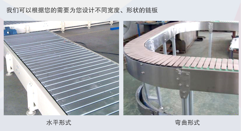 鏈板式輸送機是利用固接在牽引鏈上的一系列鏈條提供牽引力,用金屬板做為承載體使物料在水平或傾斜方向上輸送。