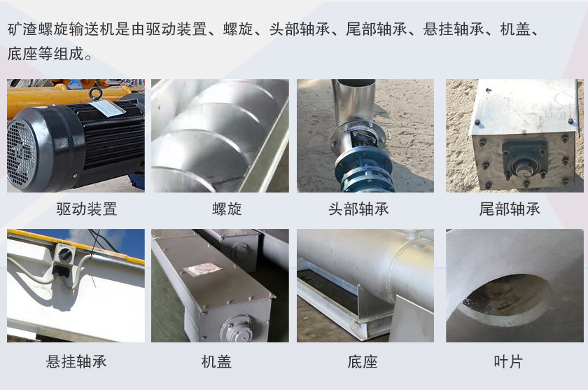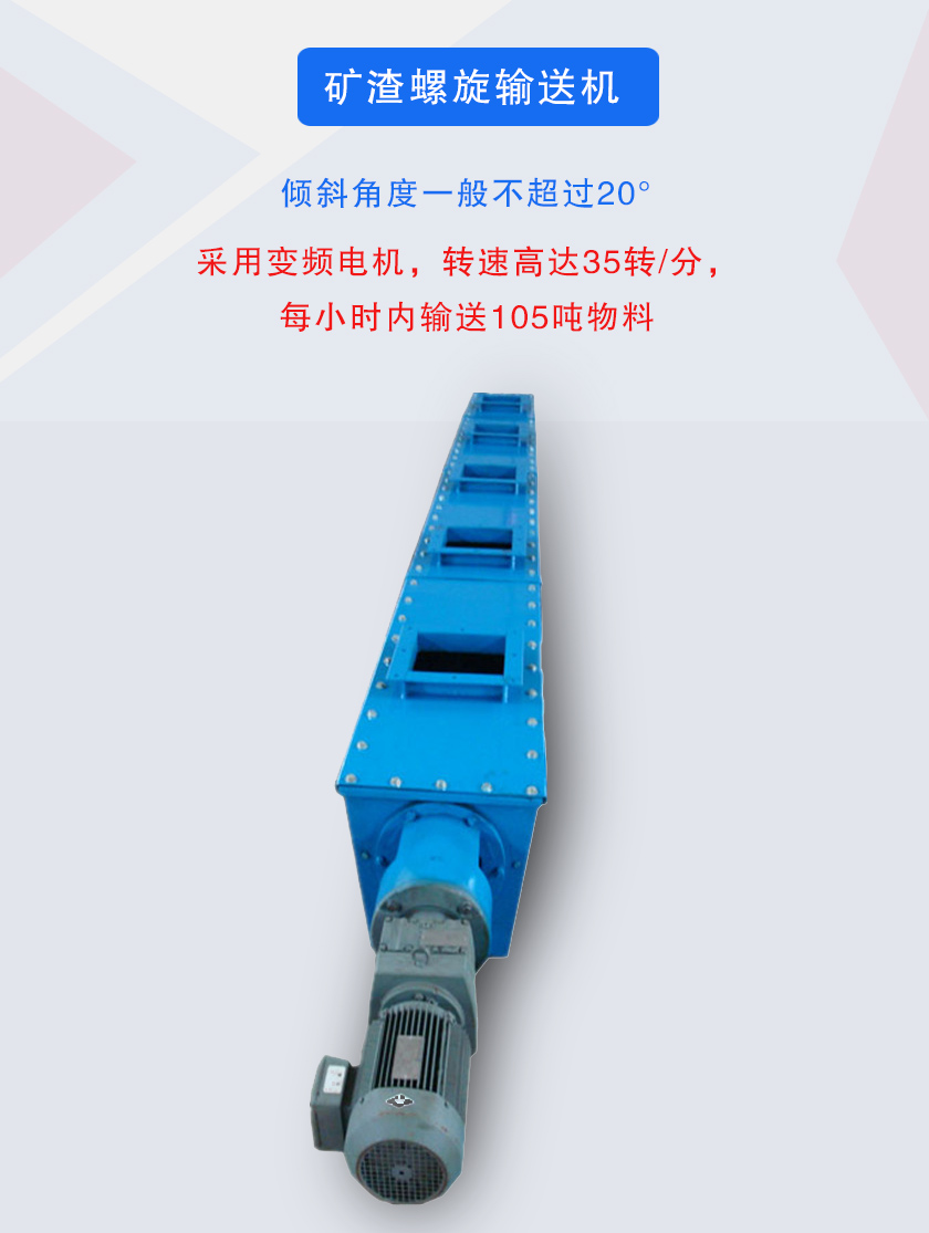 礦渣螺旋輸送機是由驅動裝置、螺旋、頭部軸承、尾部軸承、懸掛軸承、機蓋、底座等組成。驅動裝置:由電動機、減速器、聯軸器等組成。螺旋軸與吊軸承、頭部軸承、尾部軸承聯接采用嵌入舌式,安裝拆卸不需軸向移動,維修方便,采用變徑結構,增大吊軸承處的容積,避免吊軸承與物料接觸,各傳動部位采用浮動聯接方式,頭尾軸承座均在殼體外,所有軸承采用多層密封和配合密封技術,軸承使用壽命長。