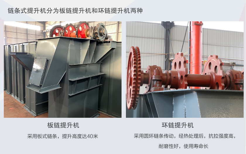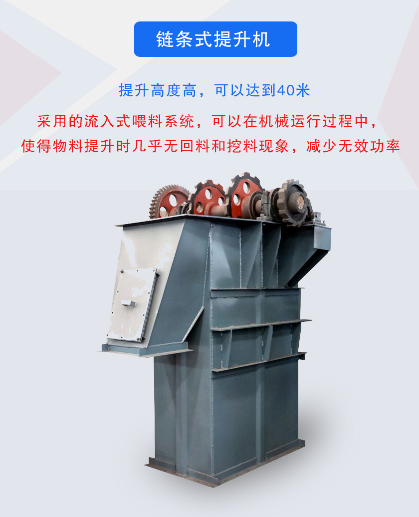 鏈條式提升機采用的是鏈條作為牽引構件,分為板鏈提升機和環鏈提升機兩種,板鏈提升機采用板式鏈條,提升高度達40米,環鏈提升機采用圓環鏈條傳動,耐磨性好,使用壽命長.