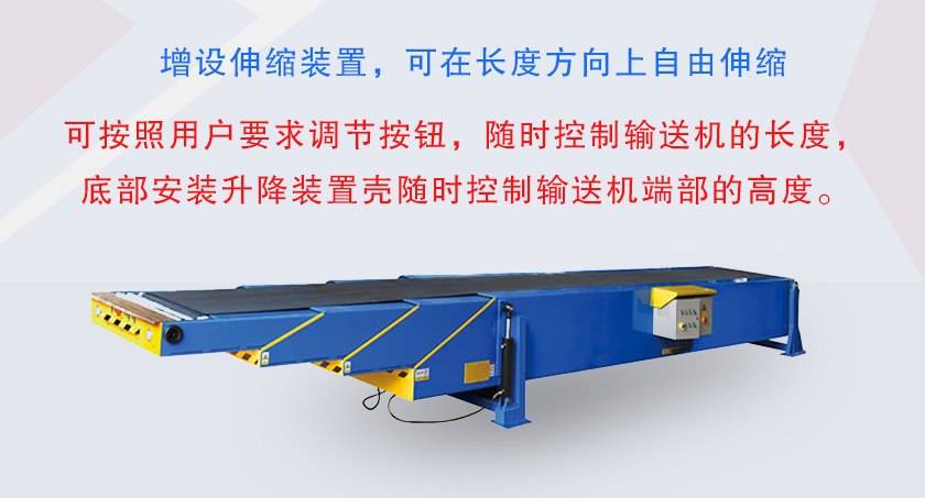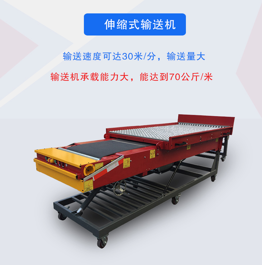 伸縮式輸送機(jī)即伸縮式皮帶,可以根據(jù)工作面位置變化調(diào)整自身長(zhǎng)度的輸送機(jī),伸縮式輸送機(jī)可在長(zhǎng)度方向上自由伸縮,自由調(diào)控輸送長(zhǎng)度,減少了裝卸貨物的時(shí)間,降低了工人的勞動(dòng)強(qiáng)度,可用于輸送粉狀、粒狀物料輸送.