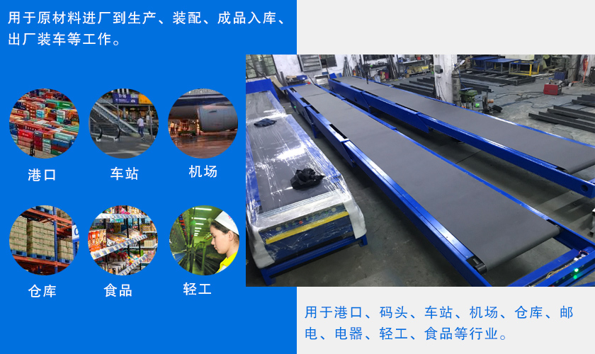 伸縮式皮帶輸送機(jī)可應(yīng)用于港口、碼頭、車(chē)站、機(jī)場(chǎng)、倉(cāng)庫(kù)、郵電、電器、輕工、食品等行業(yè)。完成物品或零件的傳輸,裝卸工作,使用于原材料進(jìn)廠到生產(chǎn)、裝配、成品入庫(kù)、出廠裝車(chē)等工作。