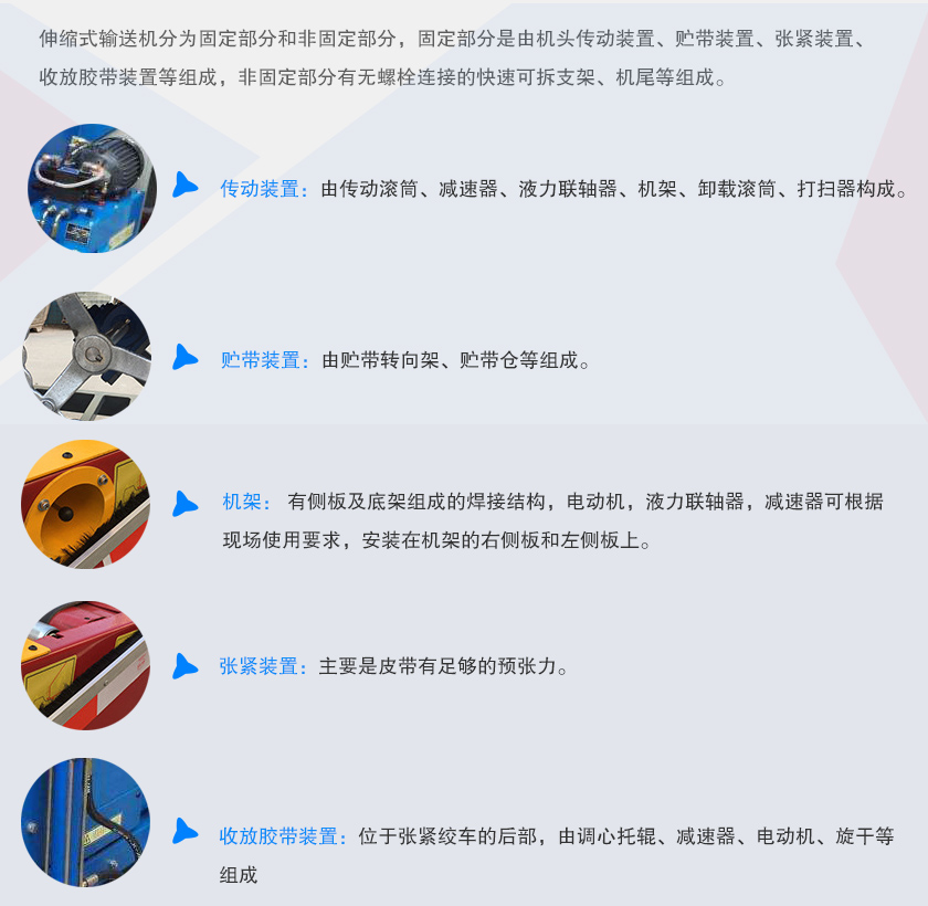 伸縮式輸送機(jī)分為固定部分和非固定部分,固定部分是由機(jī)頭傳動(dòng)裝置、貯帶裝置、張緊裝置、收放膠帶裝置等組成,非固定部分有無(wú)螺栓連接的快速可拆支架、機(jī)尾等組成。