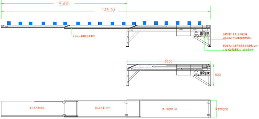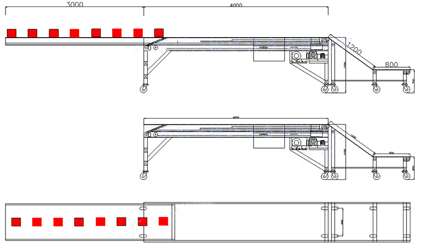 2、可按照用戶要求調(diào)節(jié)按鈕,隨時(shí)控制輸送機(jī)的長(zhǎng)度,底部安裝升降裝置殼隨時(shí)控制輸送機(jī)端部的高度。