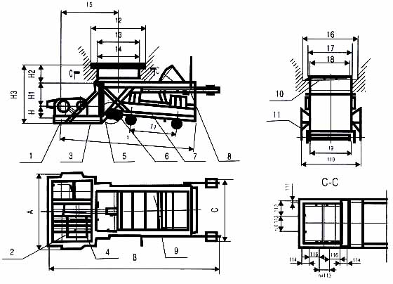 10底板有立向筋板,并用三道通長托輥支承,保證了底板本身剛度,消除了現(xiàn)有往復(fù)式給料機底板工作中彎曲變形的弊病。