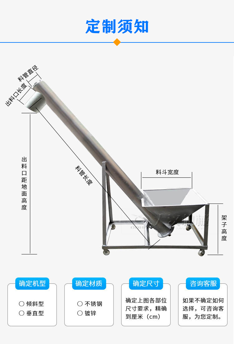 移動(dòng)螺旋輸送機(jī)長(zhǎng)度(進(jìn)、出料口的距離)越長(zhǎng),價(jià)格越貴,超過(guò)10米的,傳動(dòng)形式復(fù)雜的,價(jià)格需要另外核算。