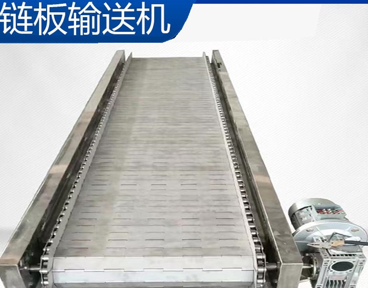 鏈板輸送機(jī)由電機(jī)、傳動(dòng)軸、鏈輪、鏈條、軸承、潤(rùn)滑劑、鏈板、滾筒、張緊設(shè)備、等組成。其中鏈條和鏈板主要起到帶動(dòng)產(chǎn)品運(yùn)動(dòng)的作用。鏈條使用循環(huán)往復(fù)運(yùn)動(dòng)提供了牽引動(dòng)力,金屬板是承載體,在鏈條牽引力的作用下承載物料沿著水平或傾斜方向輸送。