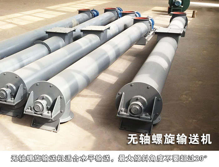 無軸螺旋輸送機適合水平輸送,傾斜角度不要超過20°(根據實際的使用情況而言。)