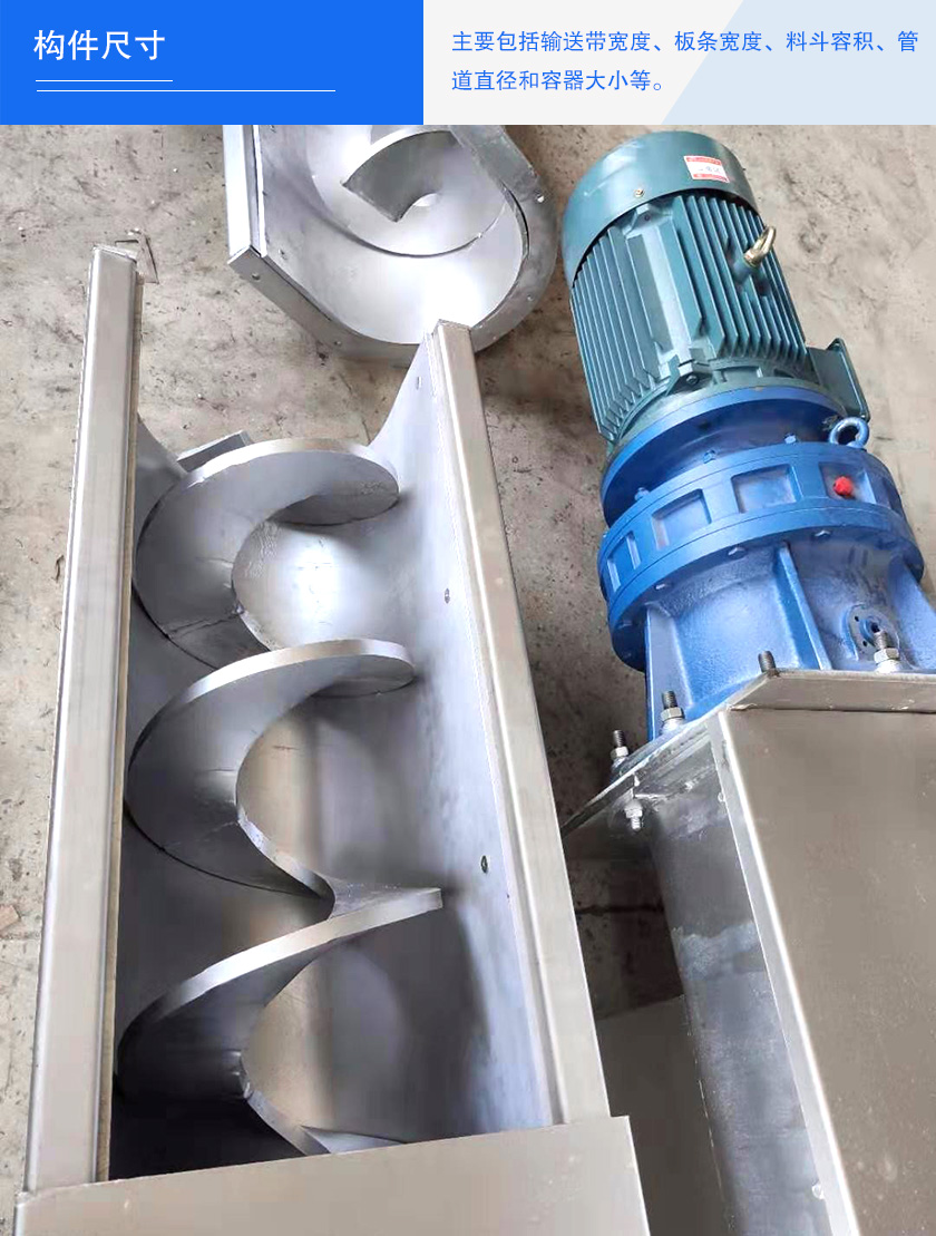 主要包括輸送帶寬度、板條寬度、料斗容積、管道直徑和容器大小等。這些構(gòu)件尺寸都直接影響螺旋給料機(jī)的輸送能力。如螺旋輸送機(jī)管徑越大,效率也就越高。當(dāng)然,并不一定就是輸送機(jī)本身才能影響效率,物料的各種性質(zhì)也都會(huì)對(duì)效率有所影響。
